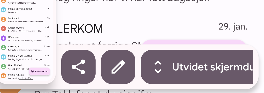 Da vil du se nederst et mini-bilde av skjermdumpen sammen med 3 knapper: Del, Rediger og Utvidet skjermdump. Det ser slik ut (men kanskje det ikke ser akkurat slik ut på din telefon):