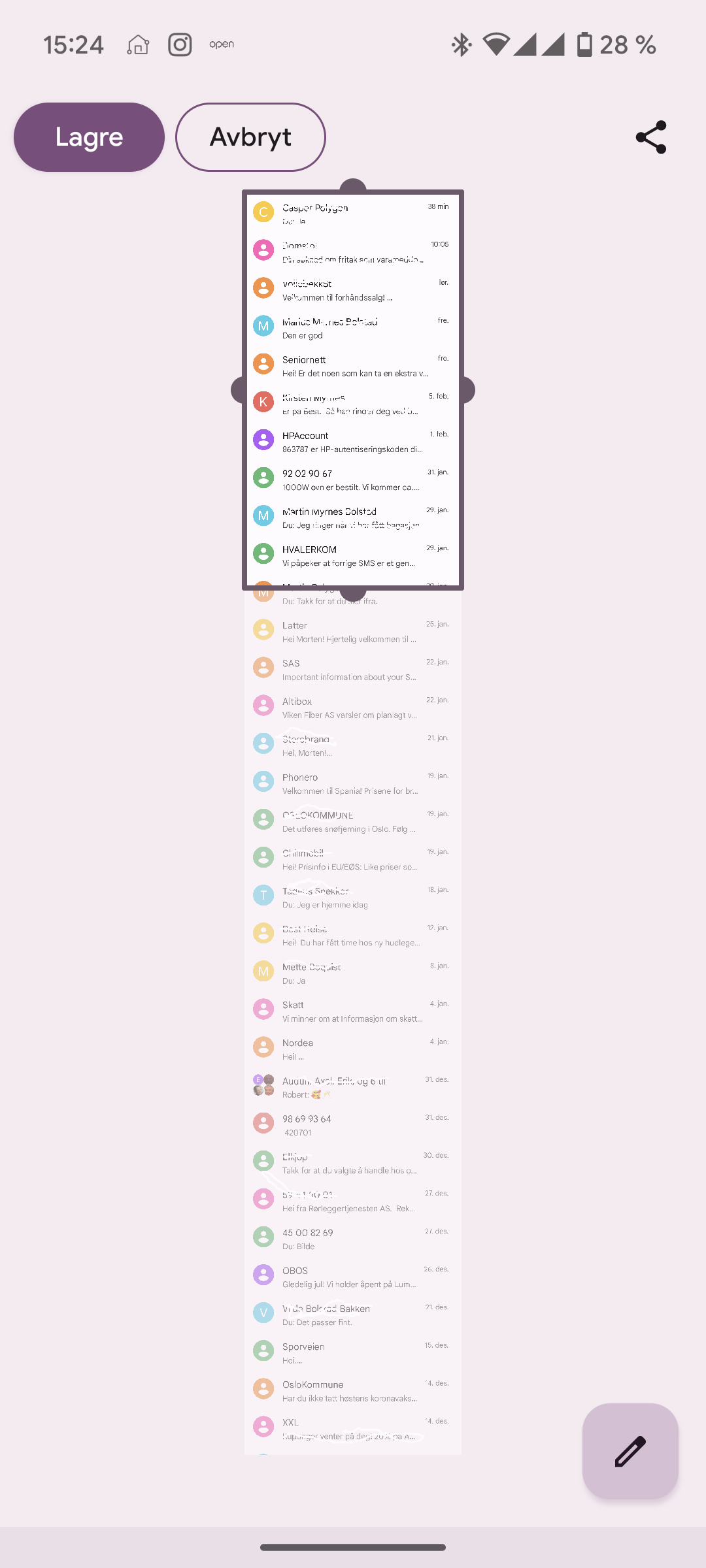 Noen ganger er skjermen du skal ta bilde av en skjerm der du kan scrolle/rulle nedover. For eksempel hvis du har listet opp alle dine SMS-er. Du ser kun noen av dem på skjermbildet, men du kan rulle nedover for å se flere. Når du tar bilde av en slik skjerm kan bildet inneholde hele lista.