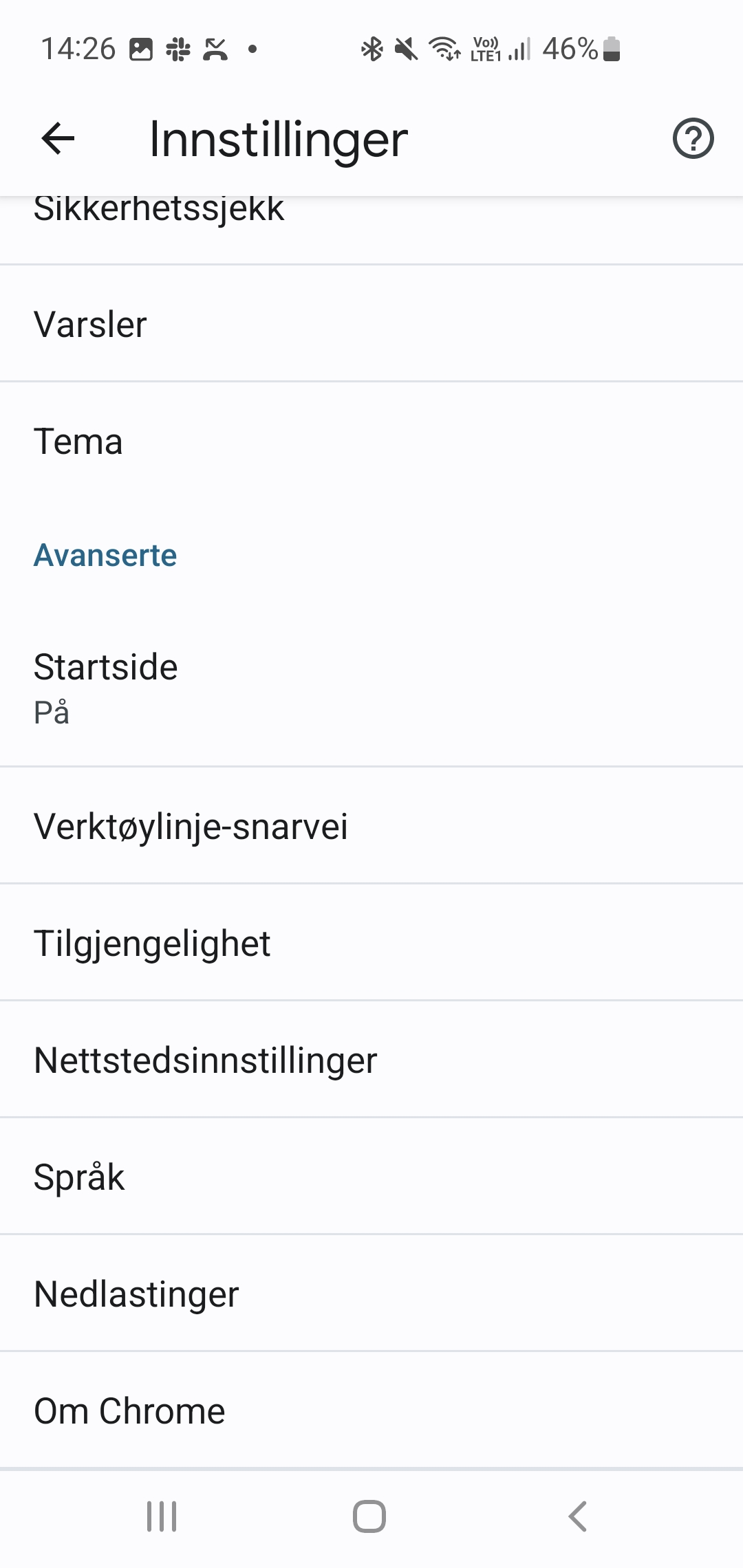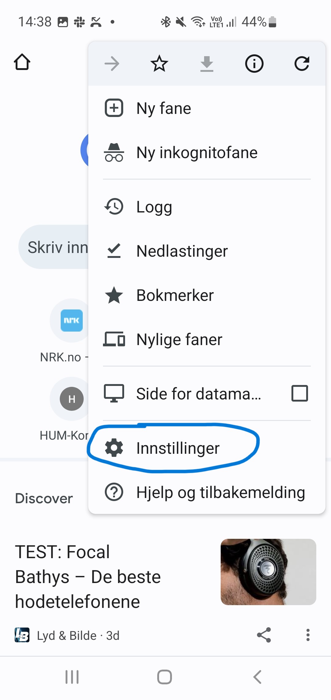 - Velg de 3 prikkene øverst i høyre hjørne. Da får du en meny. Velg «Innstillinger» fra menyen.