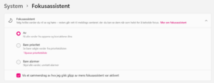 Du kan også gå inn på Fokusassistent via Innstillinger: (Innstillinger -> System -> Fokusassistent)