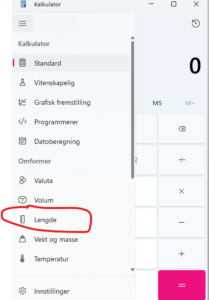 Du starter Kalkulator ved å søke opp «Kalkulator» i søkefeltet på pc-en. Eller du kan gå via Start-knappen og finne den blant alle dine programmer. Trykk på de 3 strekene øverst til venstre, da ser du alle mulige omforminger.