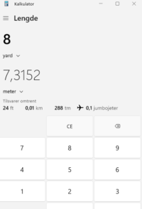 Og taster inn 8 (fordi vi ønsker å finne ut hvor mange meter 8 yards er). Resultatet ser slik ut: