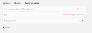 Prøv deg frem. Aktiver og prøv med ulik styrke. Når du er fornøyd kan du sette på en tidsplan for når kveldsmodus skal være aktiv.