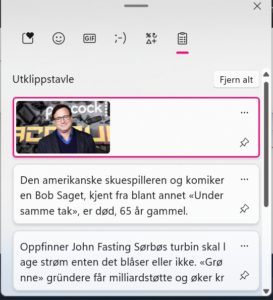 Du kjenner kanskje hurtigtastene for kopiering (Ctlr+C) og lim inn (Ctrl+V) av tekst og bilder. Dette er veldig kjekt når man skal kopiere fra et sted til et annet. Men «lim inn» (CTRL+V) limer kun inn siste objekt (tekst eller bilde) du har kopiert. Det finnes også en mulighet til å kunne lime inn fra alle tekstene og bildene du har kopiert (siden du startet opp) ved å bruke Windows-tast + V istedenfor Ctrl+V.
