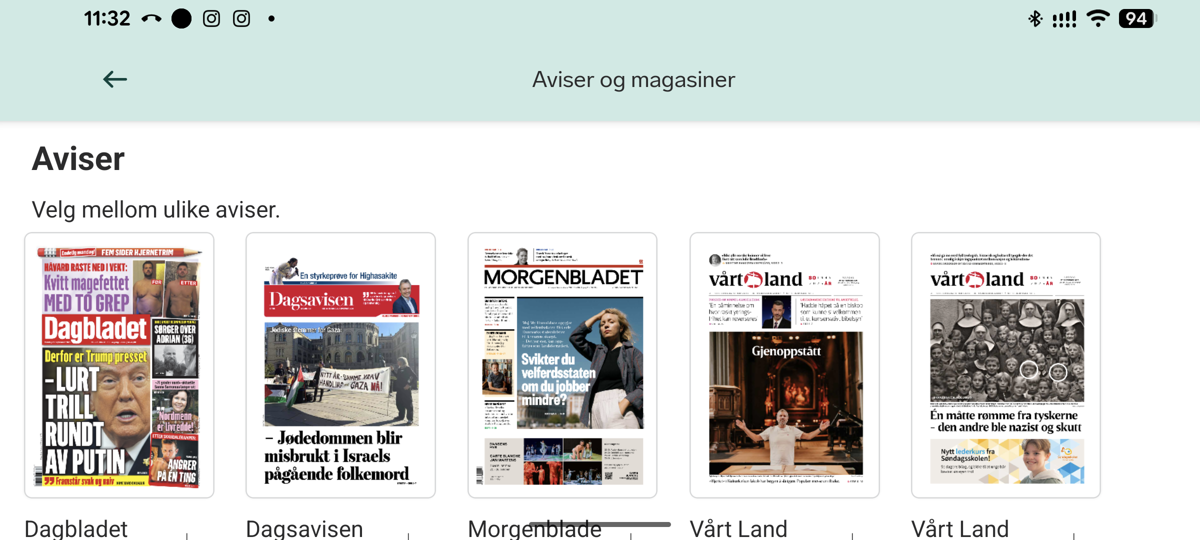Vil du lese en av avisene eller magasinene? Trykk på den og den lastes ned til ditt nettbrett/telefon.