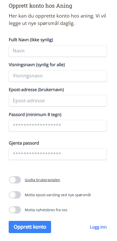 Vil du motta e-post hver gang de legger ut nytt spørsmål (det vil si hver dag) haker du av for Motta epost-varsling ved nye spørsmål.