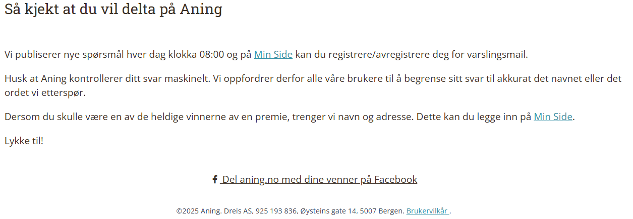Nå er du klar. Gå til startsiden igjen (aning.no) eller trykk på logoen øverst til venstre.. Du er nå logget inn.