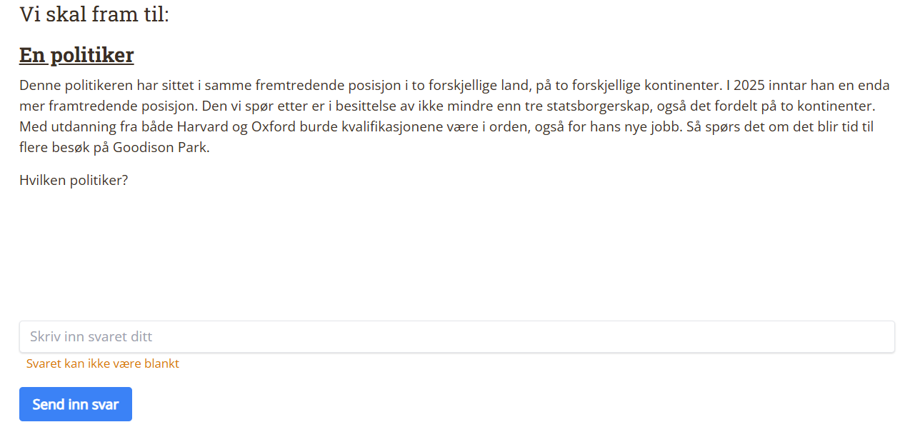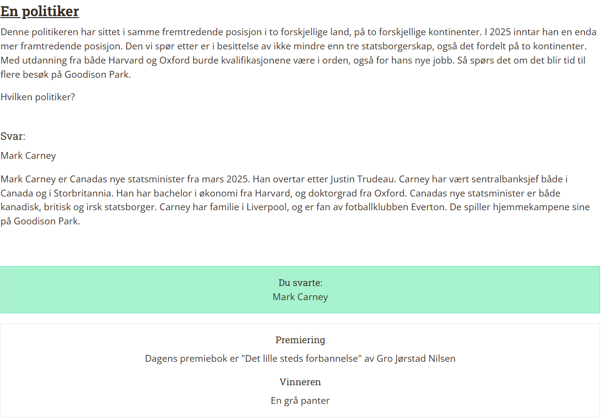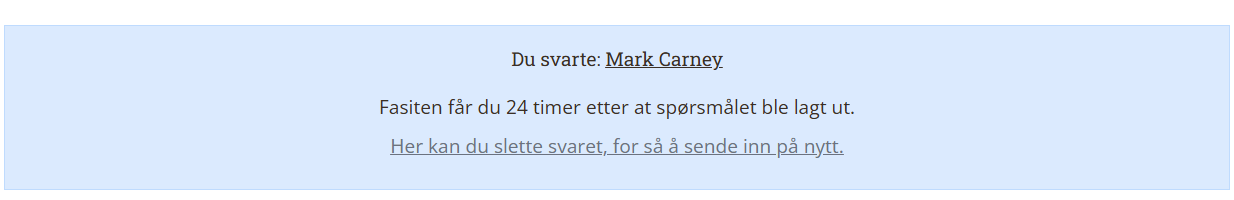 Jeg tror svaret er Mark Carney, så jeg skrev det der det står Skriv inn svaret ditt og jeg trykket på knappen Send inn svar.