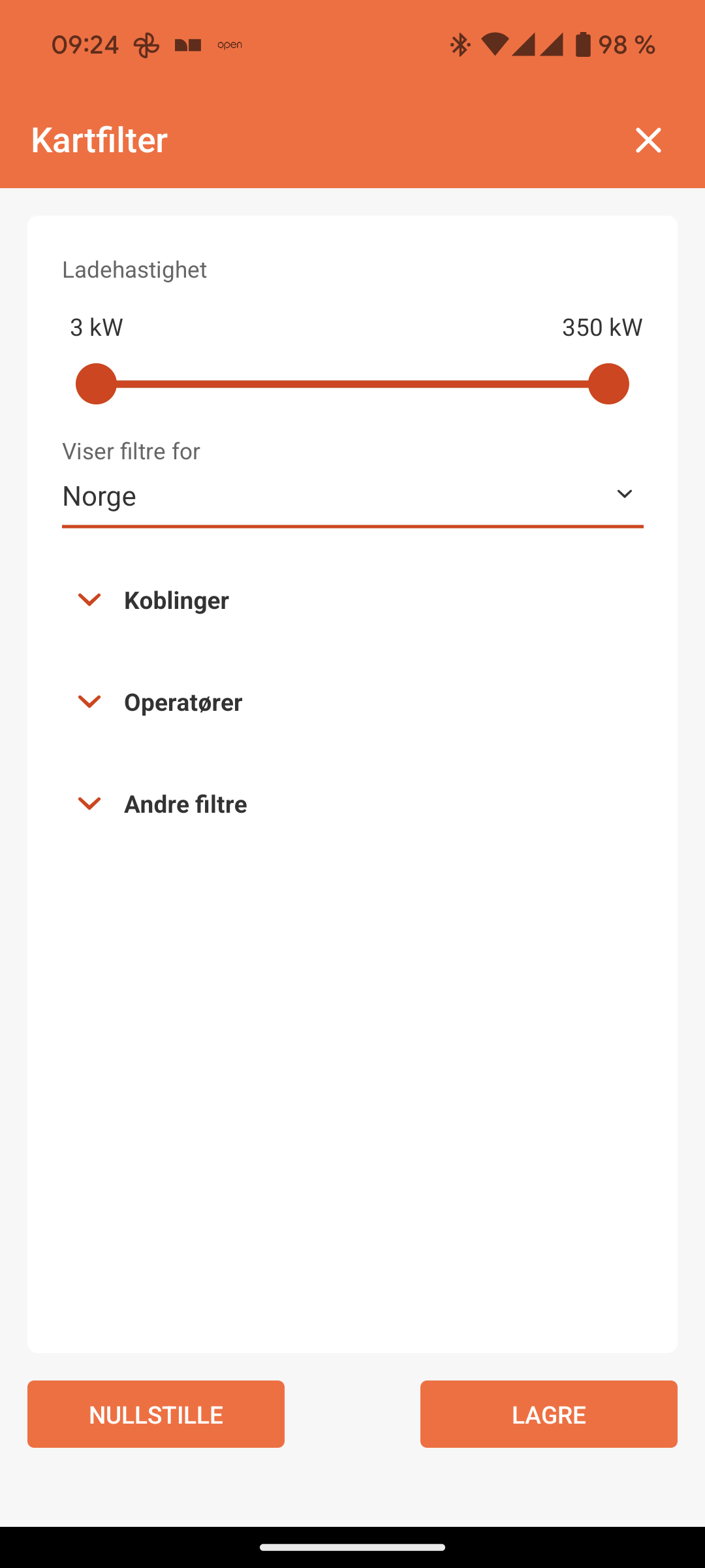 Du kan filtrere slik at den bare viser stasjoner som har en viss type ladekontakt, har en viss effekt eller kun vise for enkelte lade-leverandører.