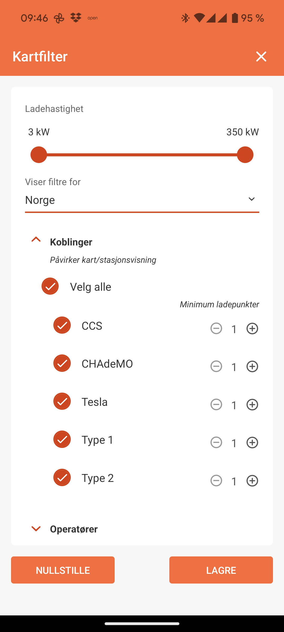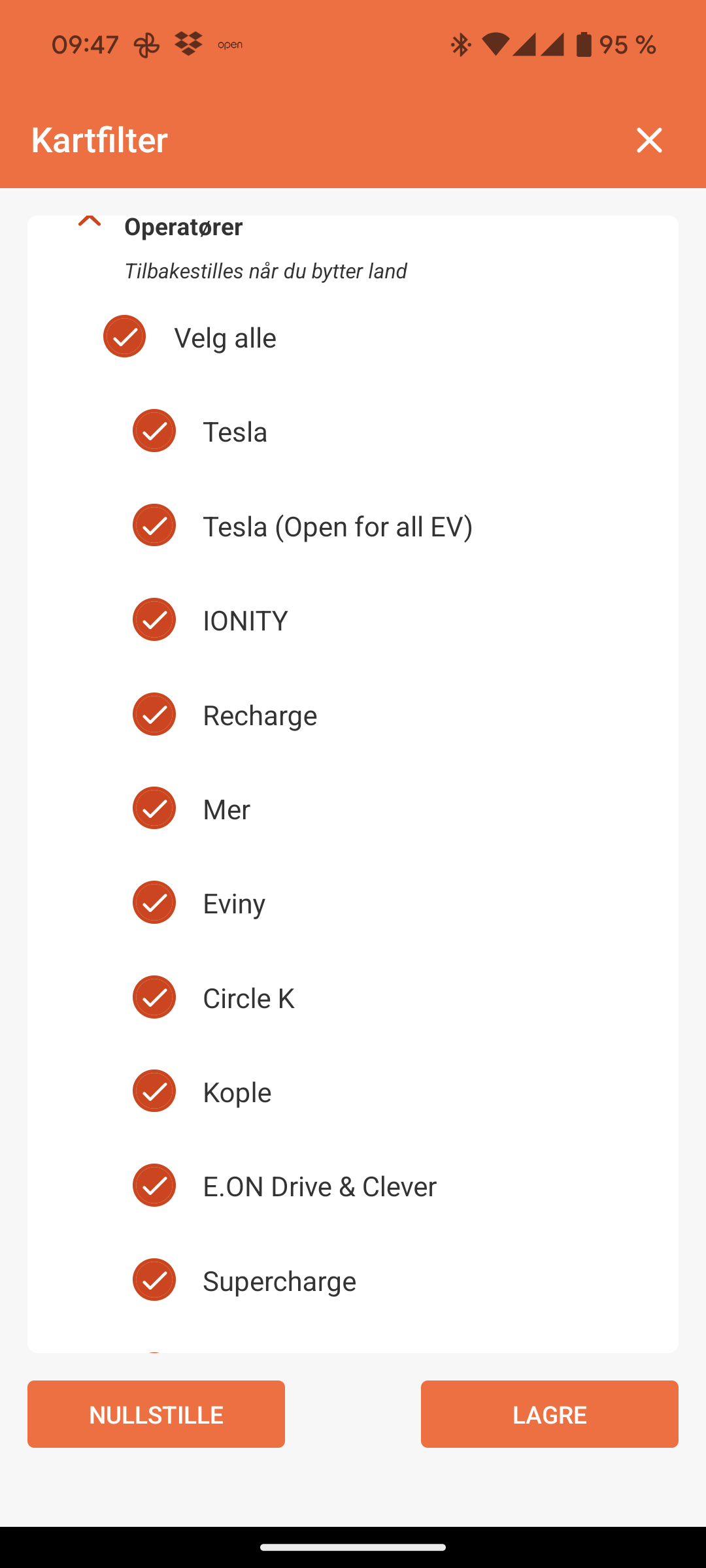 Her velger du hvilke ladeoperatører du ønsker å se. Jeg velger noen av dem