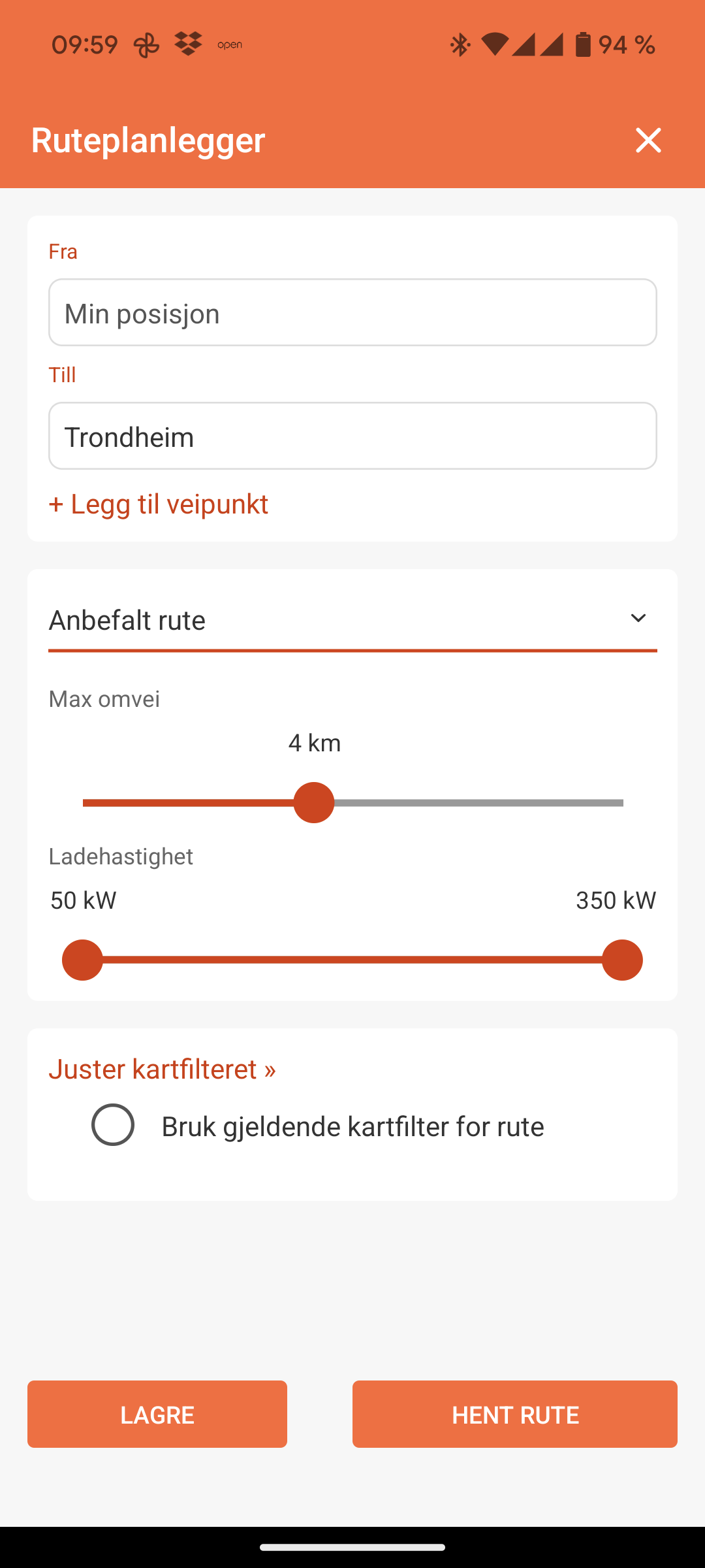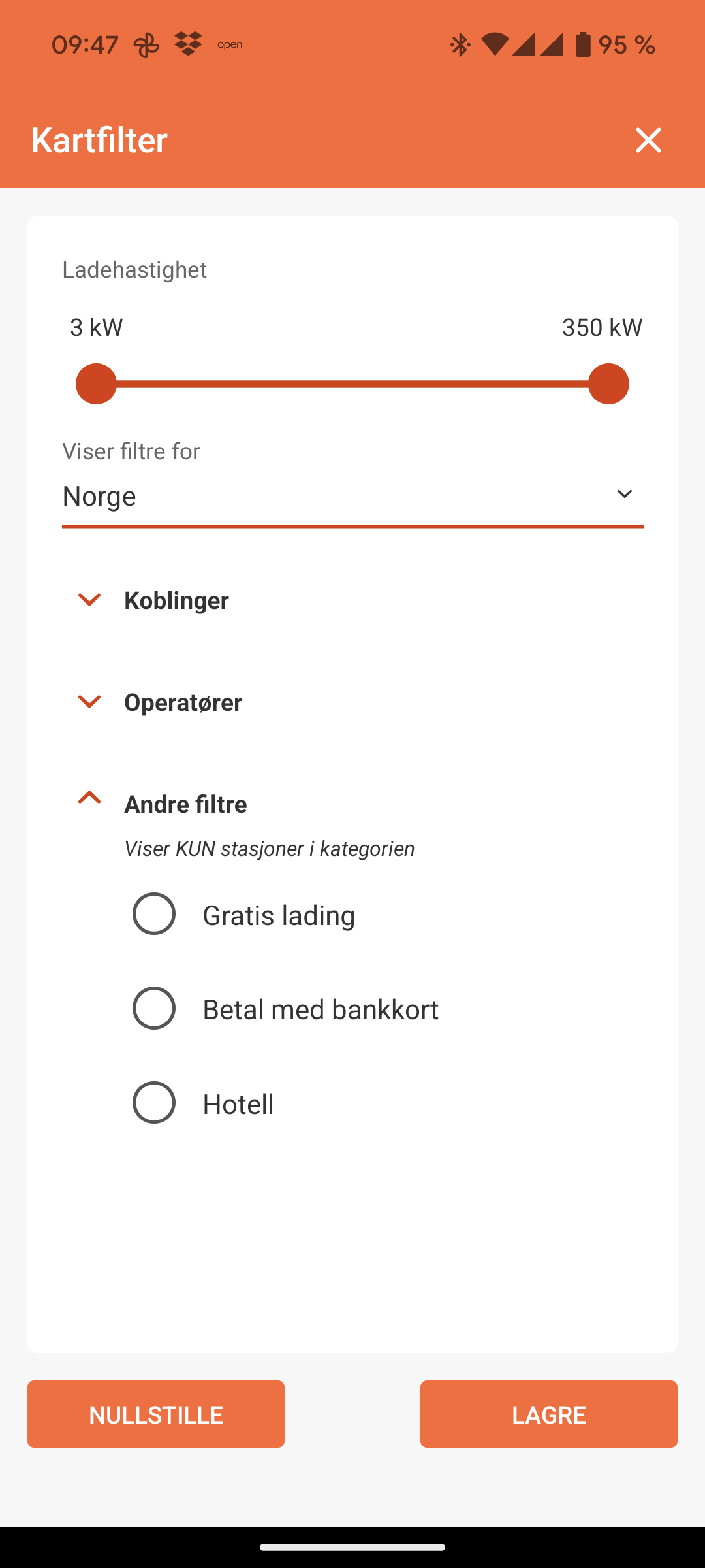 - Du kan filtrere slik at den bare viser ladestasjoner som er relevante for deg