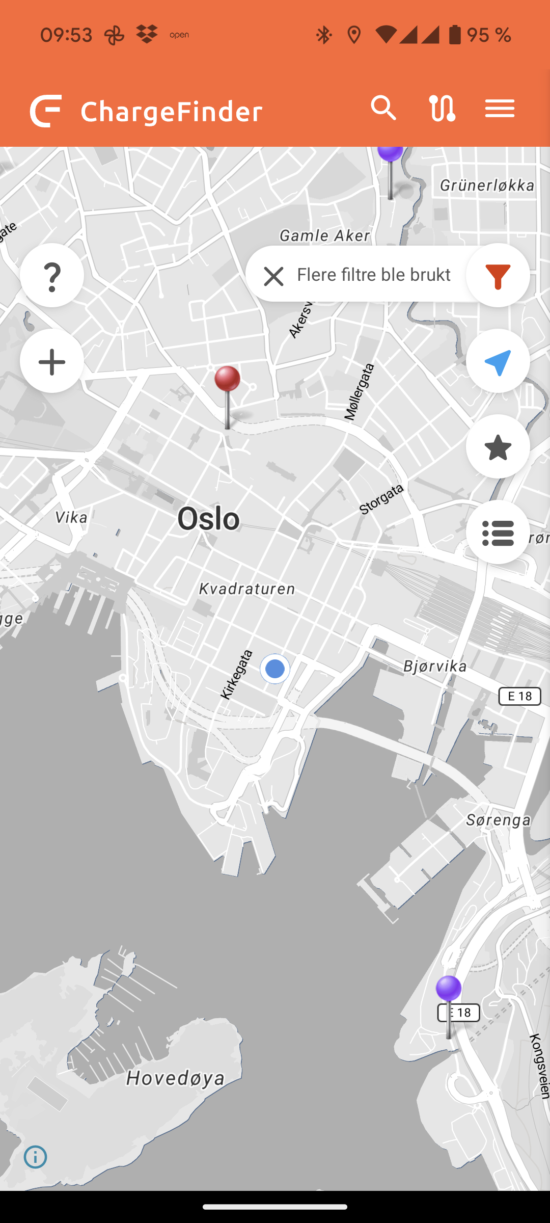 Som du ser kan vi her velge å bruke det lagrede filter eller ikke. Jeg valgte ikke å bruke det lagrede filter og får da opp alle ladestasjoner på ruta: