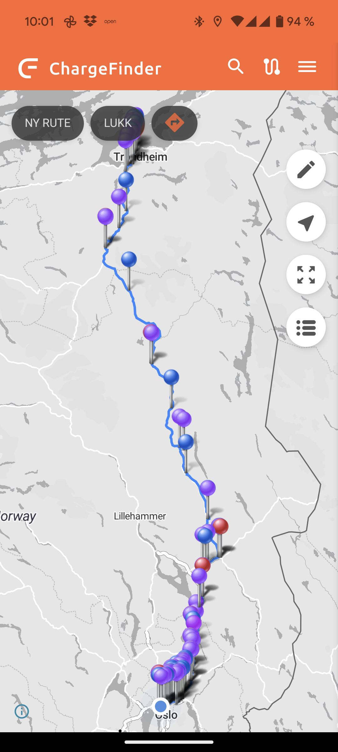 Skal du ut å kjøre langtur er det fint å se på forhånd hvilke ladestasjoner som finnes langs ruta. Trykk på rute-symbolet