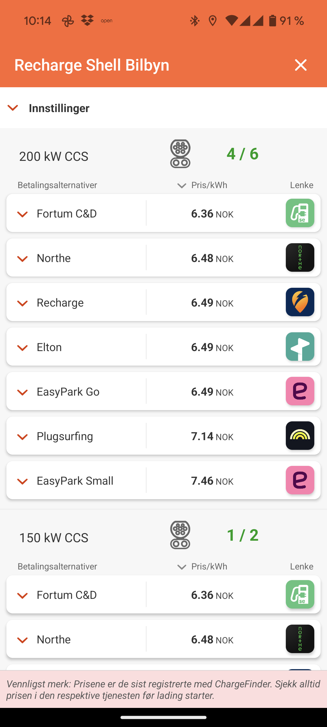 Trykk på «Priser og betalingsmåter» så ser vi også hvilke lade-apper man kan bruke og prisene: