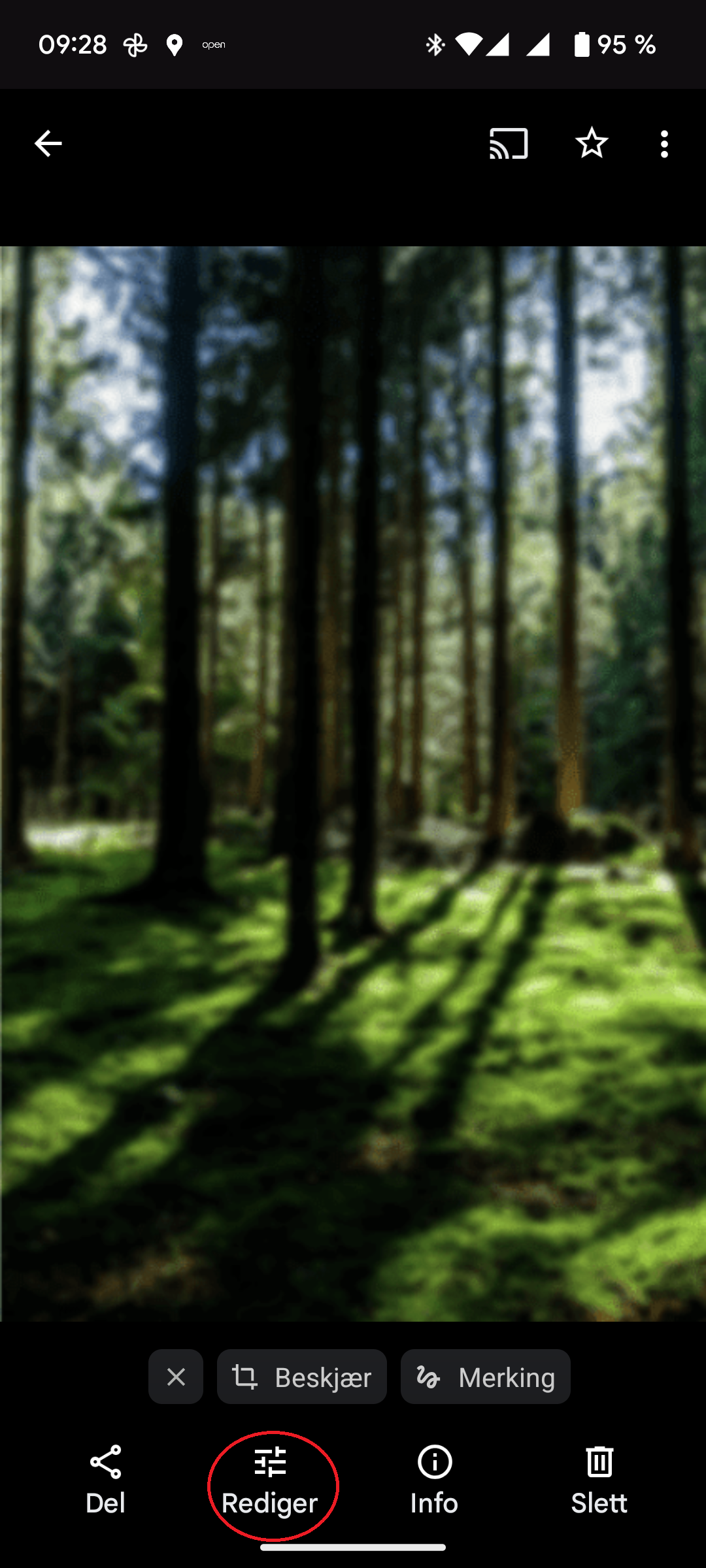Når du ser på et bilde i appen Google Foto har du noen muligheter til å forbedre bildet. Se de ulike valgene nederst. Velg Rediger.