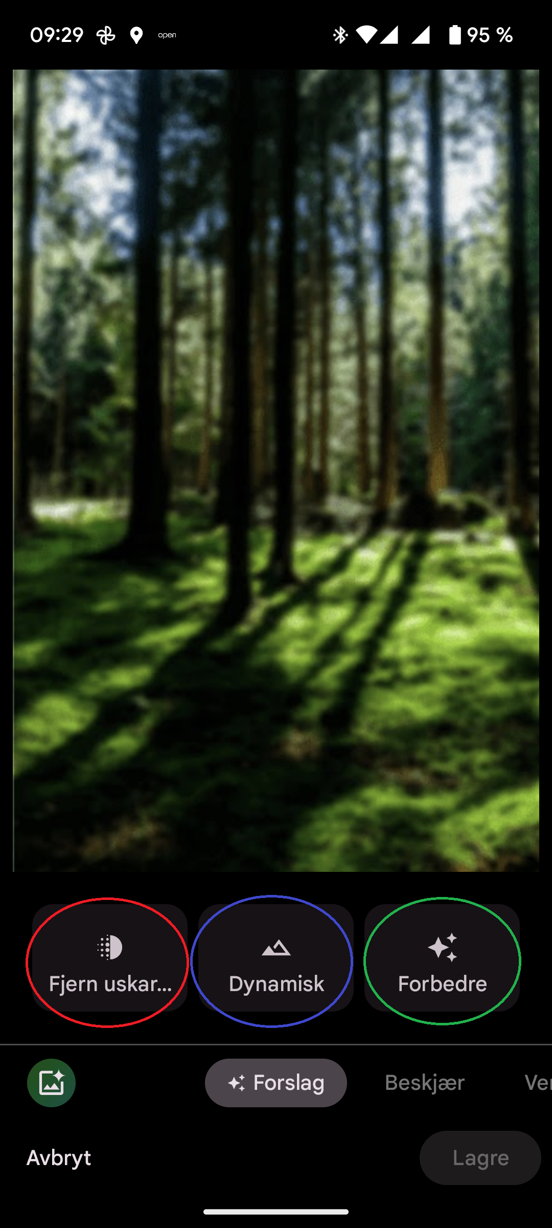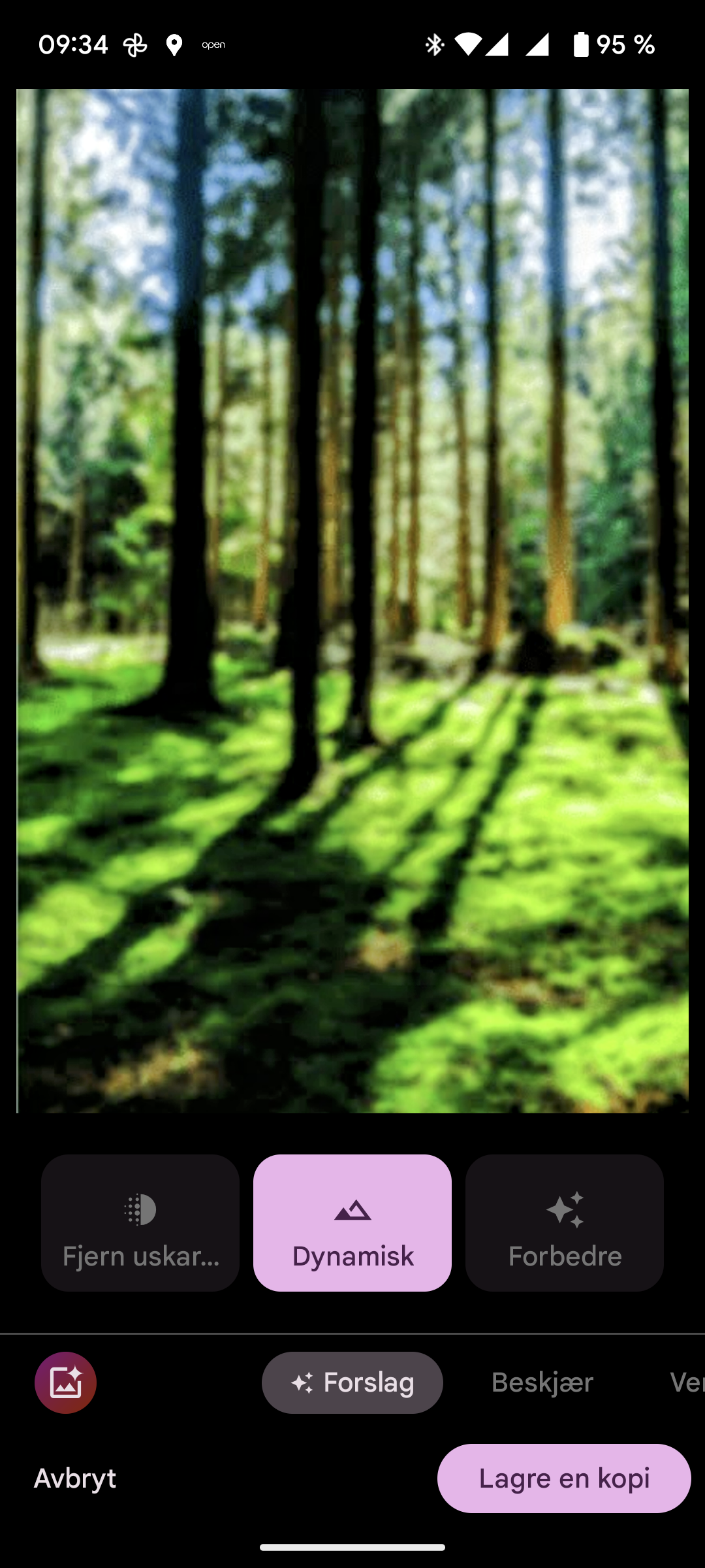 Da kommer det opp ulike valg for hvordan du kan forbedre bildet. Appen foreslår her 3 ulike metoder: Fjern uskarphet, Dynamisk og Forbedre.