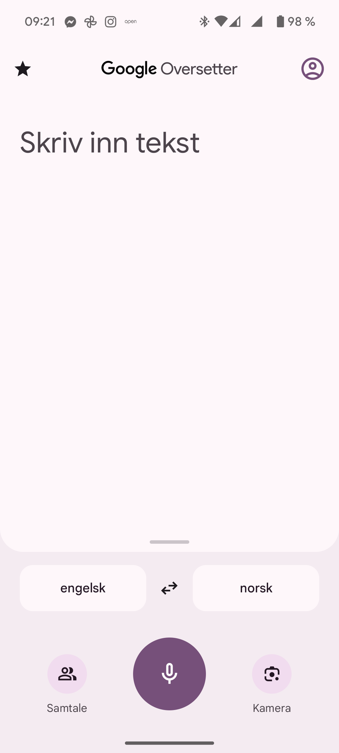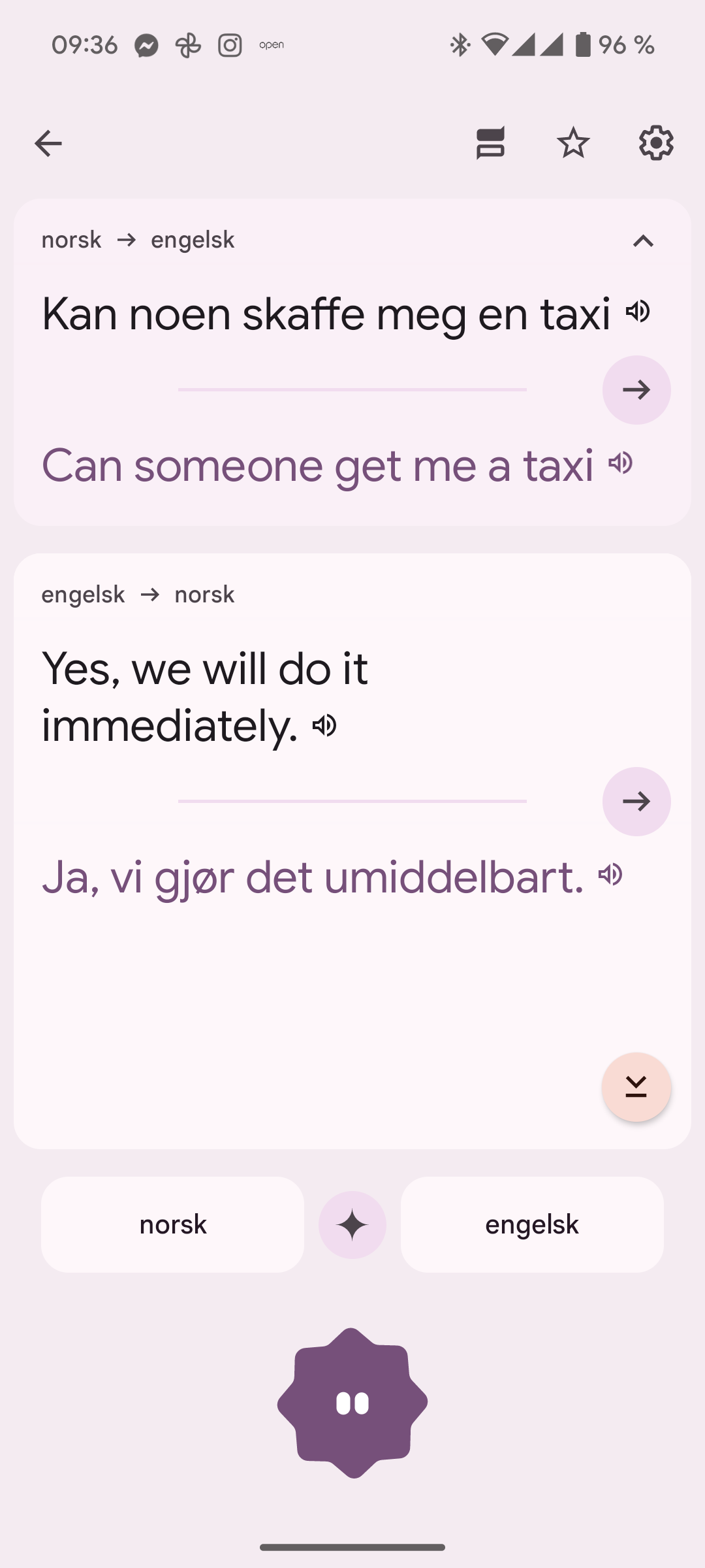 Trykk på Samtale nederst på startbildet. Da vil den oversette etter hvert som du (og den du snakker til) snakker. Den vil oversette begge veier.