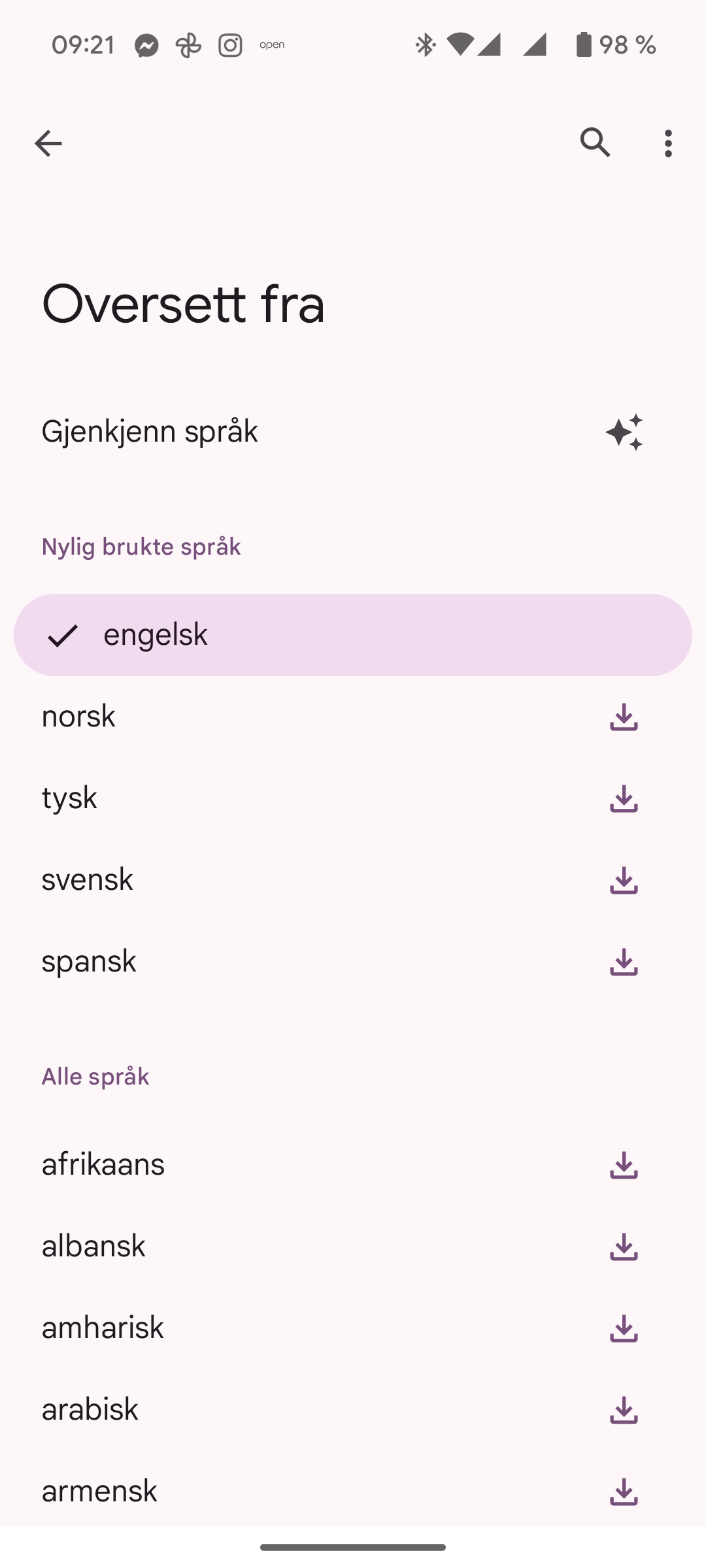 Når jeg trykker på engelsk kommer det opp alle språk jeg kan oversette fra: