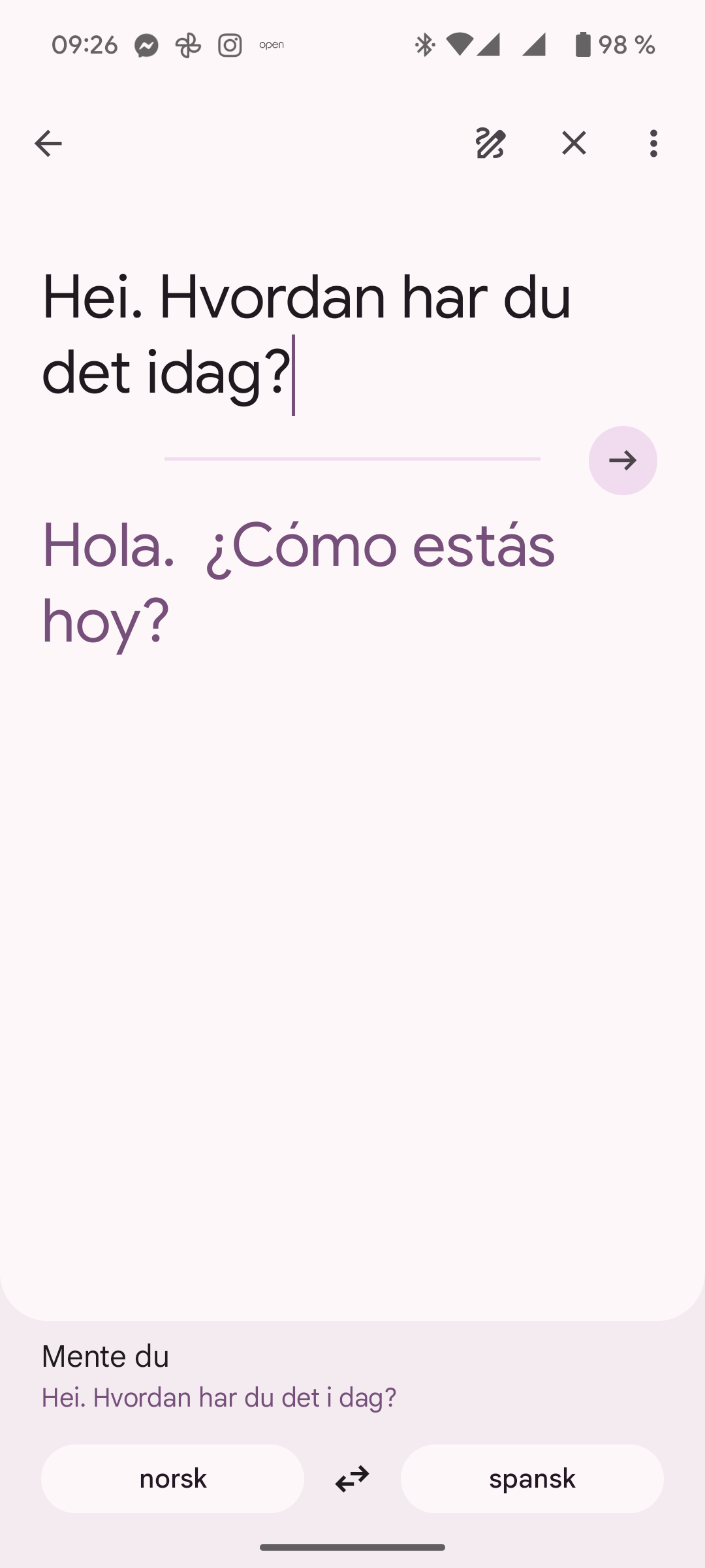 Jeg prøver å oversette en tekst fra norsk til spansk. Jeg skriver inn øverst: «Hei. Hvordan har du det idag?»
