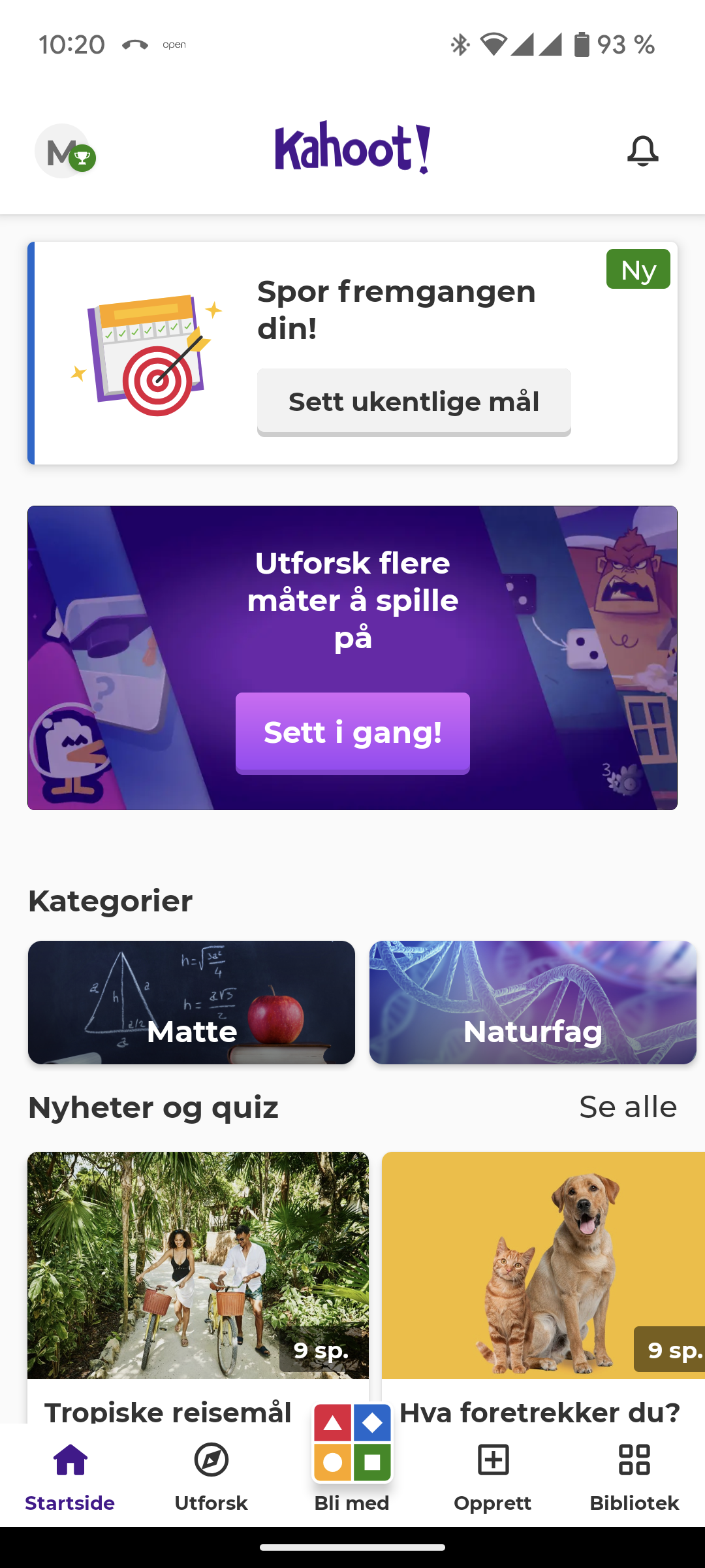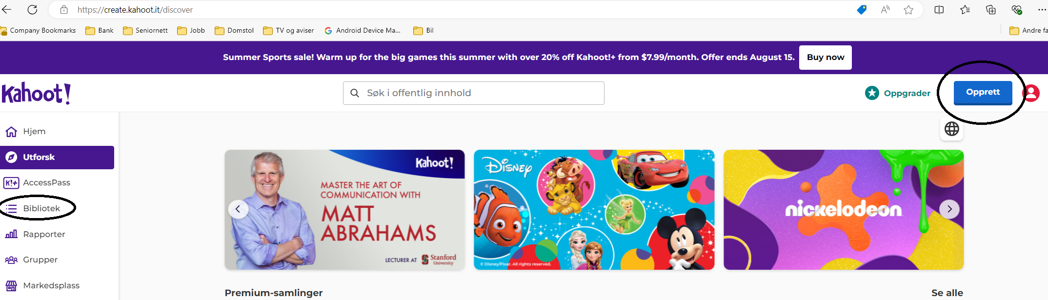 Her skal du velge «Opprett» for å opprette en ny quiz eller «Bibliotek» for å se på eller endre de du tidligere har laget.