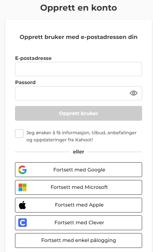 For å lage en spørrekonkurranse må du opprette en bruker og et abonnement. Kahoot vil selvfølgelig helst at du oppretter et betalings-abonnement, men det trenger du ikke.
