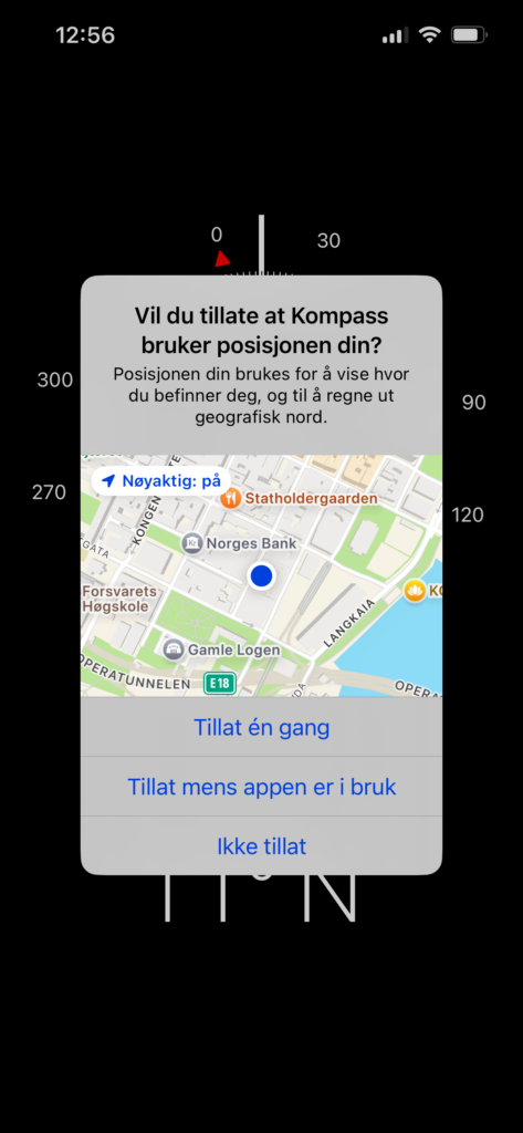 Første gang du åpner appen vil den be om tillatelse til å bruke posisjonen din. Her kan du velge hva du er komfortabel med, i dette tilfellet ble det valgt «Tillat mens appen er i bruk«.