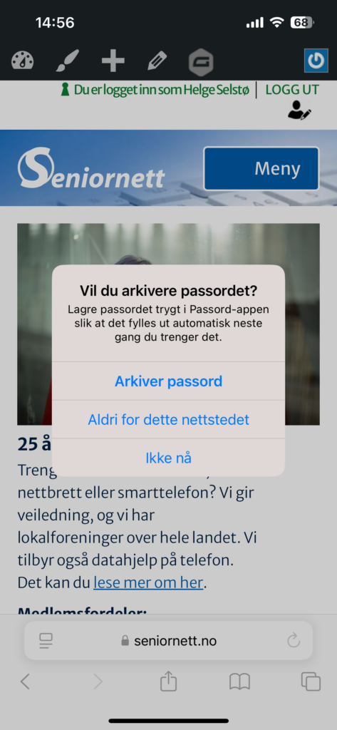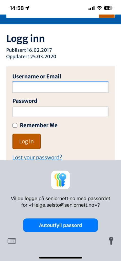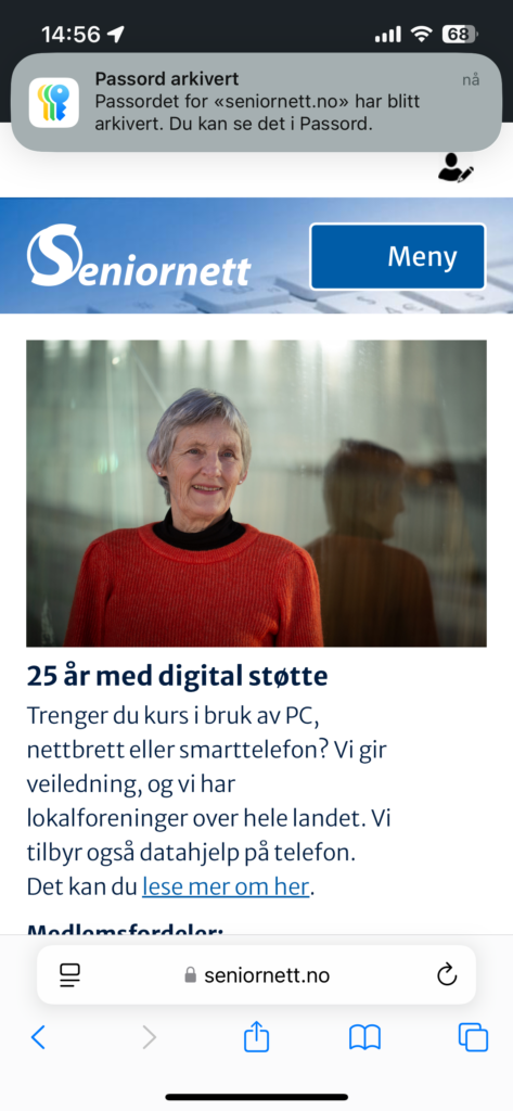 Nese gang du skal logge deg inn på seniornett.no vil appen se at her er passordet lagret og boksen med «Autoutfyll passord» dukker opp. Da er det bare å trykke på den blå knappen og du blir logget rett inn. Dette er utrolig praktisk og smart. Du slipper å huske passord og brukernavn og det blir skrevet inn korrekt med en gang.