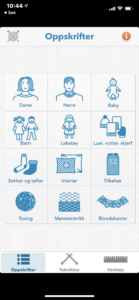 Åpningssiden til Strikke er oppskrifter. Noen av oppskriftene er gratis, andre koster penger. Vi skal se på «verktøy» som ligger nede til høyre. Under verktøy ligger omgangsteller, masketabell og øke- eller fellekalkulator.