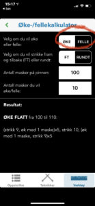 Her kan du få utregnet hvor mange masker du må strikke mellom hver økning eller felling slik at du får det jevnt. Du kan velge om du skal ha utregning for økning eller felling. Det feltet som er hvitt er det aktive feltet. I dette tilfellet har vi valgt å øke. Andre valget er om du strikker rundt eller flatt, frem og tilbake. Det feltet som er hvitt er det aktive feltet. Legg deretter inn antall masker du har på pinnen. Trykk mot tallet, i vårt eksempel 100 og talltastaturet åpner seg. Skriv inn korrekt antall masker. I feltet under legger du til hvor mange masker du skal ha etter økningen. Svaret får du umiddelbart. For å øke til 110 masker må du strikke 9 masker, øke med 1 maske 5 ganger. Deretter skal du strikke 10 masker, øke med 1 maske én gang, og strikke 9 masker og øke 1 maske 5 ganger til.