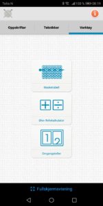 Velger du omgangsteller åpner et mørkt felt seg. Hver gang du klikker inne i det mørke feltet øker tallet med én. Selv om du lukker ned appen og åpner den igjen så husker appen hvor mange omganger du har lagret. Nullstill antall omgangen med å klikke på den oransje knappen «nullstill». Klikker du på krysset lukkes omgangstelleren uten å miste antall omganger.
