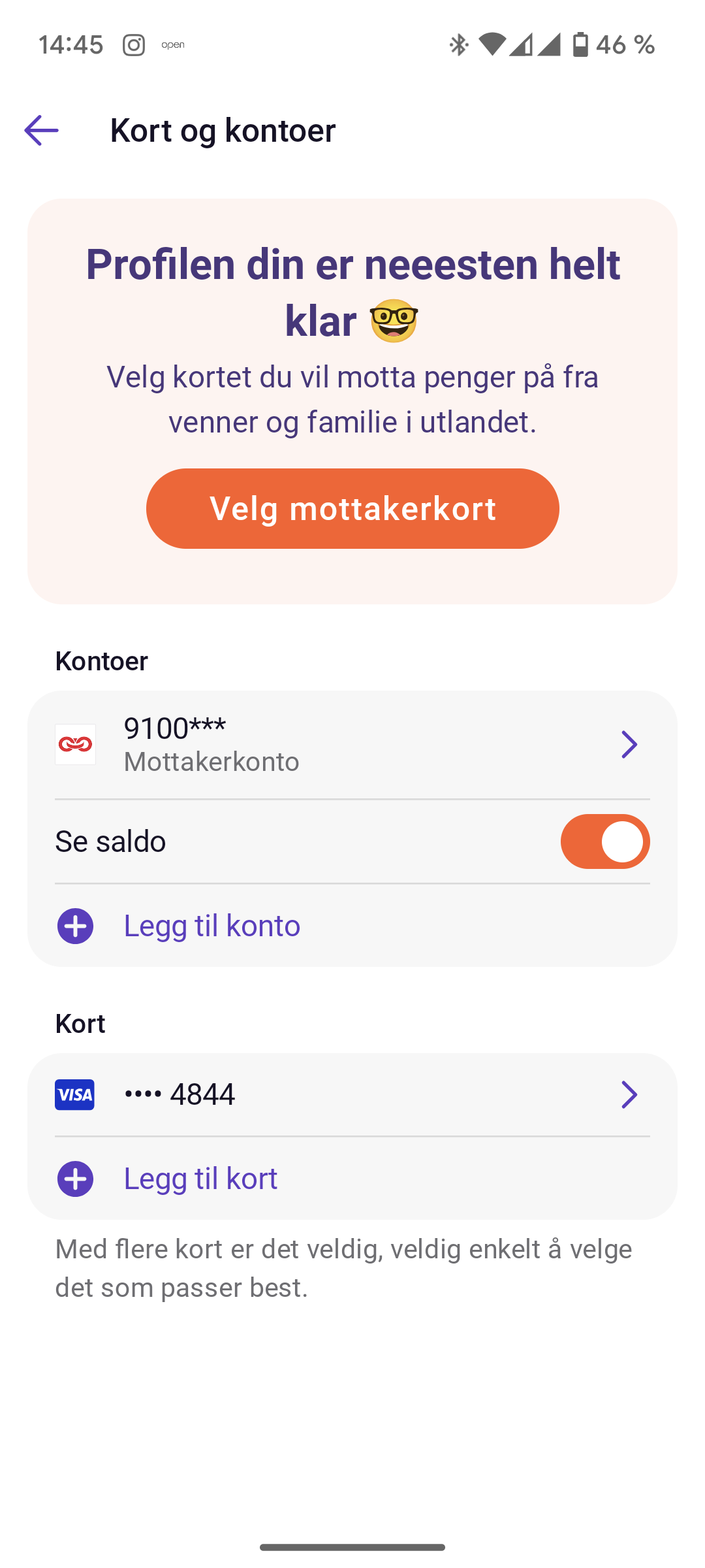 Det er det bankkortet mottaker har knyttet til Vipps-kontoen. Skal du motta penger fra andre må du også ha registrert et bankkort pengene skal gå inn på. Dette kan ikke være et kredittkort men et såkalt debetkort (vanlig bankkort knyttet til en konto). Det holder altså ikke med kun en bankkonto. Gå inn på Profil og velg Kort og kontoer