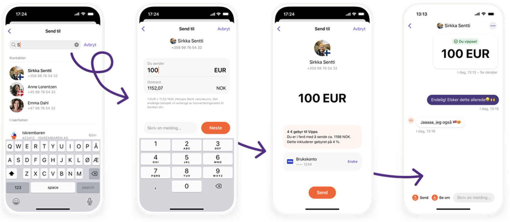 Slik kan det se ut i app-en når du sender 100 EUR til en i Finland: